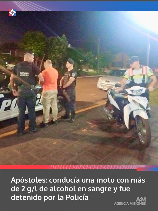 Frente a estas circunstancias, se le practicó el test de alcoholemia, cuyo resultado arrojó 2,16 gramos de alcohol por litro de sangre, confirmando que conducía en estado de ebriedad. Como consecuencia, el motociclista fue demorado y trasladado a la Comisaría Primera de Apóstoles.