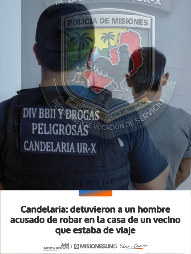 AGENCIA MISIONES.UNO | Un hombre de 37 años fue detenido en Candelaria, acusado de haber cometido un robo en la vivienda de un vecino que se encontraba fuera del país. El sospechoso fue localizado tras una investigación policial y quedó a disposición de la Justicia.