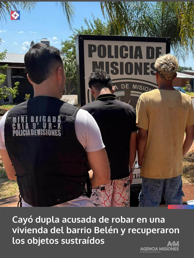 AGENCIA MISIONES.UNO | Tras una investigación coordinada, efectivos policiales detuvieron en Posadas a dos hombres de 24 y 30 años vinculados a un robo ocurrido días atrás en una vivienda del barrio Belén y recuperaron gran parte de los elementos denunciados como sustraídos.