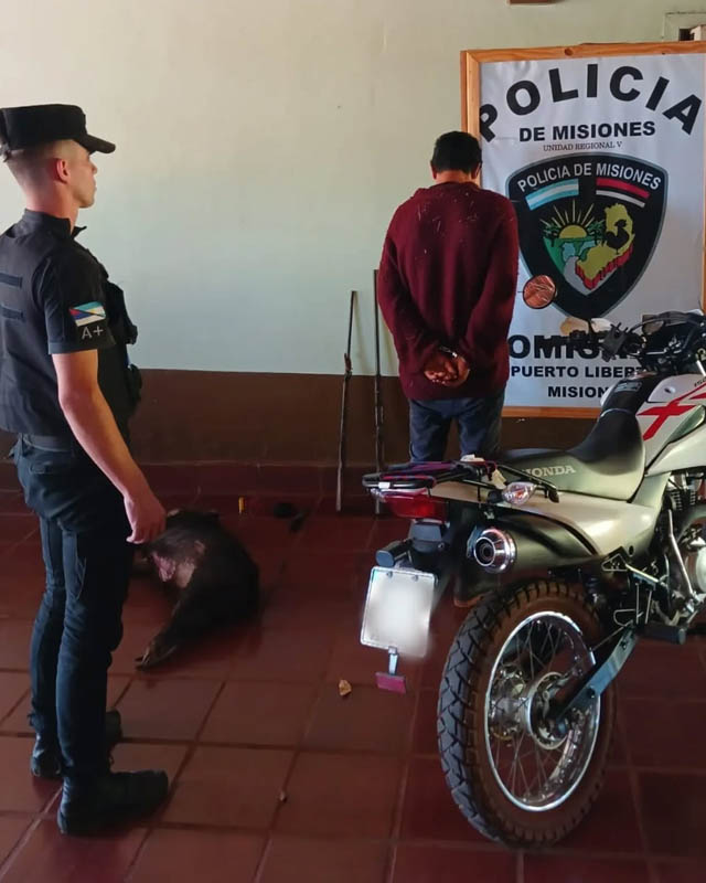 Durante una recorrida por el área, los uniformados interceptaron a un hombre de 31 años que se encontraba dentro del monte. En su poder se secuestraron dos escopetas de distintos calibres sin marca ni numeración visible, municiones, un cuchillo de grandes dimensiones, una motocicleta y un ejemplar de fauna silvestre, identificado como pecarí.
