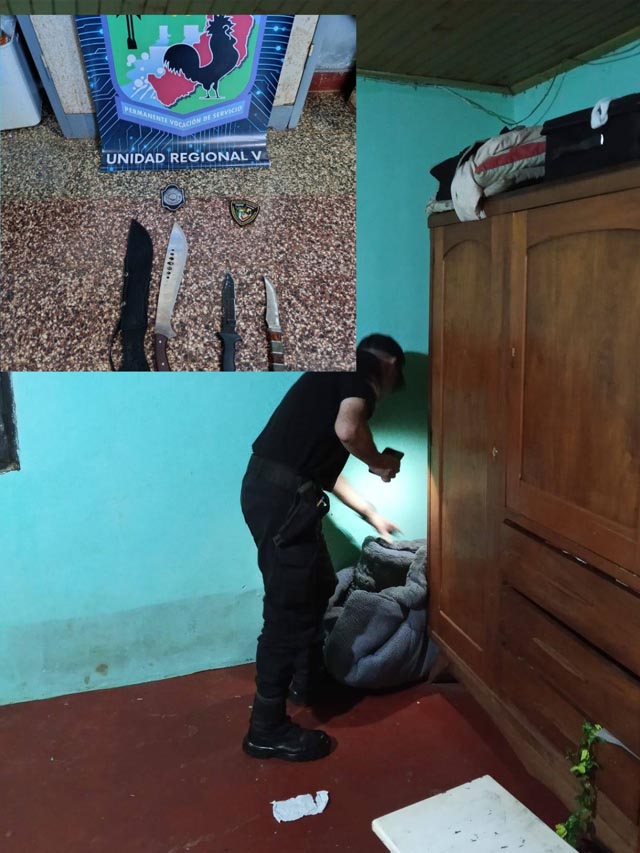 Durante el procedimiento también se secuestraron cuchillos tipo puñal que quedaron a disposición de la Justicia como elementos de interés para la investigación, mientras que el acusado fue trasladado y alojado en sede policial.