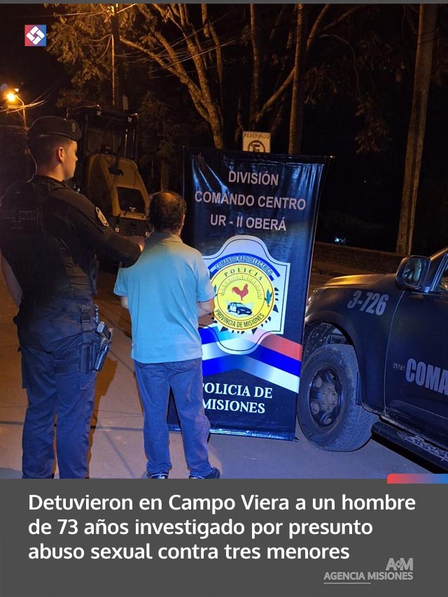 AGENCIA MISIONES.UNO | Un hombre de 73 años fue detenido por la Policía en la localidad de Campo Viera en el marco de una investigación por un presunto caso de abuso sexual que involucra a tres niñas. La denuncia fue realizada por una mujer que alertó sobre los relatos de las menores, quienes habrían señalado al acusado como responsable de conductas inapropiadas.