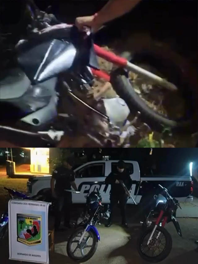 Las tareas se concretaron en una zona rural comprendida entre los parajes Laguna Azul y Tres Vecinos, donde los efectivos hallaron tres motocicletas ocultas entre malezas y pastizales. Tras las verificaciones correspondientes, se constató que los rodados presentaban pedido de secuestro por robo.