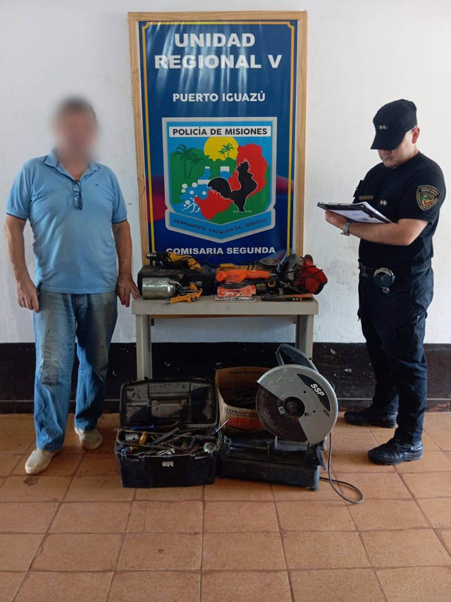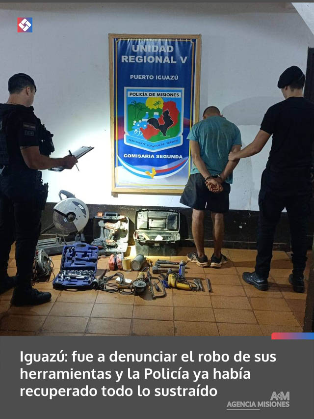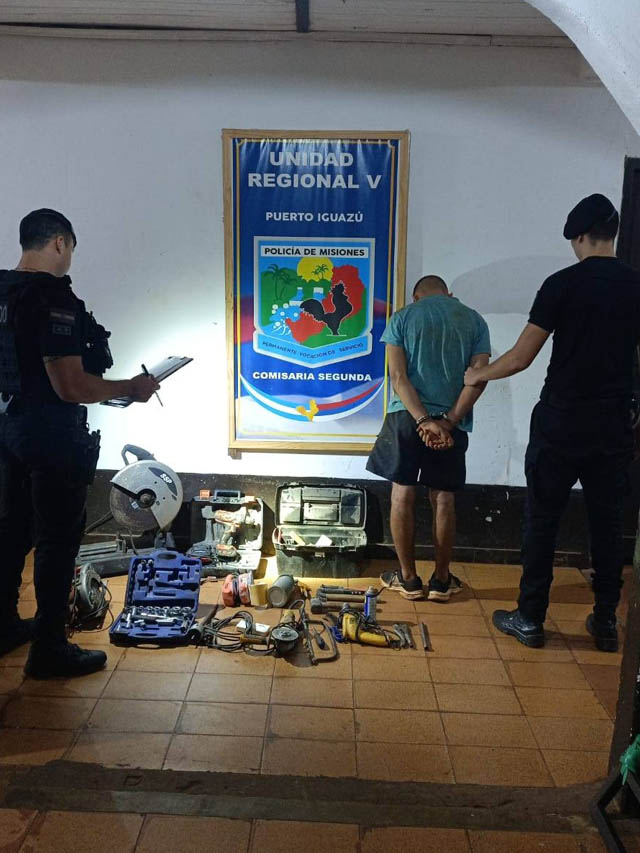 AGENCIA MISIONES.UNO | Un hecho de robo fue esclarecido en la madrugada de este lunes en la ciudad de Puerto Iguazú, donde efectivos policiales lograron recuperar la totalidad de las herramientas sustraídas de un taller y detener al presunto autor del ilícito, incluso antes de que la víctima realizara la denuncia formal.