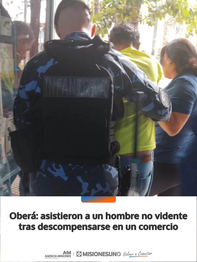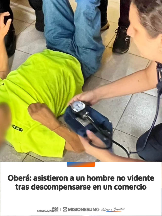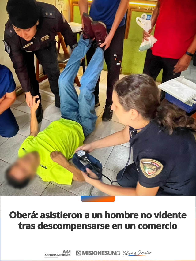 AGENCIA MISIONES.UNO | Un hombre de 67 años fue asistido por efectivos policiales y personal de salud luego de descompensarse en el interior de un local comercial sobre la avenida Sarmiento de Oberá. El rápido accionar permitió brindarle atención inmediata y trasladarlo a un centro de salud.