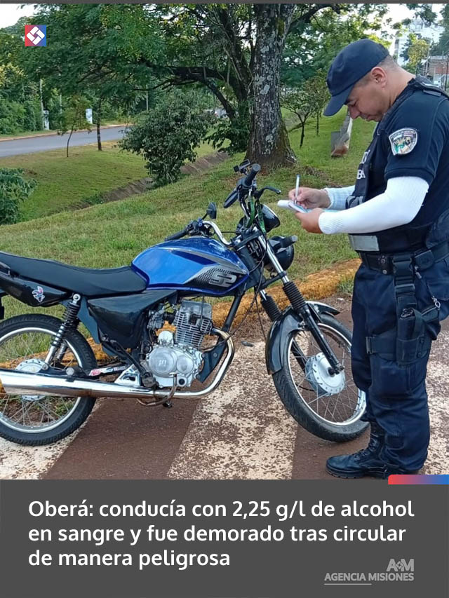 AGENCIA MISIONES.UNO | Un joven de 23 años fue demorado en Oberá luego de ser detectado circulando en aparente estado de ebriedad y sin la documentación obligatoria sobre la avenida Américas. El test de alcoholemia arrojó 2,25 gramos por litro de alcohol en aire espirado.