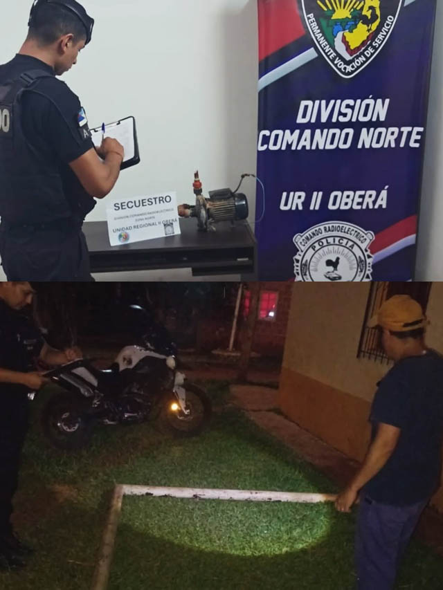 El primer hecho fue denunciado por una mujer de 62 años, quien advirtió que desconocidos habían cortado caños de PVC y sustraído una bomba de agua de su propiedad ubicada en el Lote 82. A partir de la denuncia, personal del Comando Norte inició tareas investigativas para dar con el elemento robado.