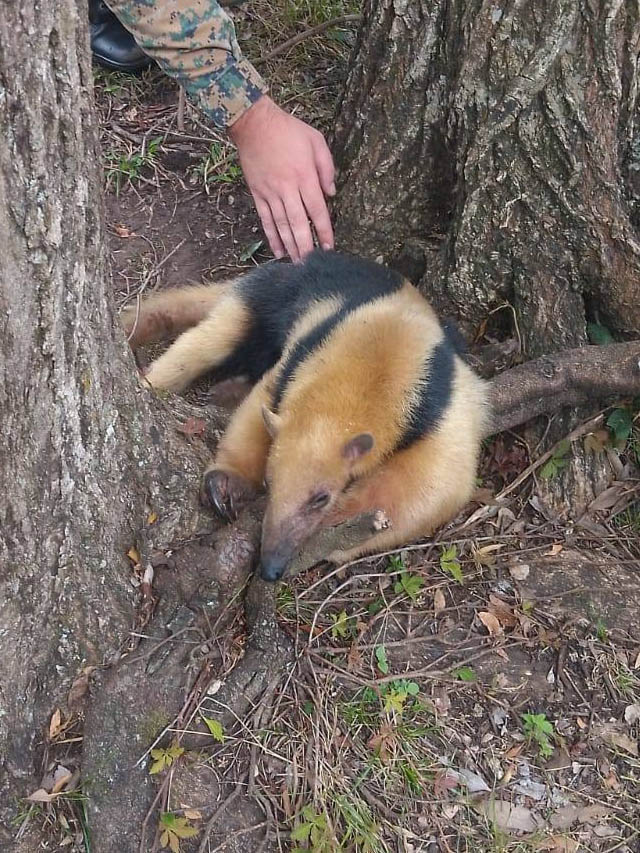 En el lugar, los efectivos procedieron al rescate de un ejemplar de oso melero (Tamandua tetradactyla), que fue resguardado y examinado por un profesional veterinario. Luego de constatar su estado sanitario, se dispuso su entrega a personal de Fauna Silvestre para su posterior liberación en un entorno natural adecuado.