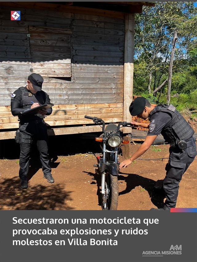 AGENCIA MISIONES.UNO | Efectivos de la Comisaría y de la División Comando Radioeléctrico de Villa Bonita secuestraron una motocicleta que era utilizada para realizar maniobras peligrosas y generar fuertes explosiones con el caño de escape sobre la Ruta Provincial 103, situación que generaba reiteradas quejas entre los vecinos de la zona.